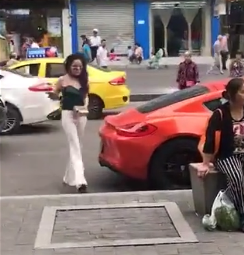 "重庆保时捷"女车主再现街头,仍穿白色喇叭裤,但这一次不戴帽